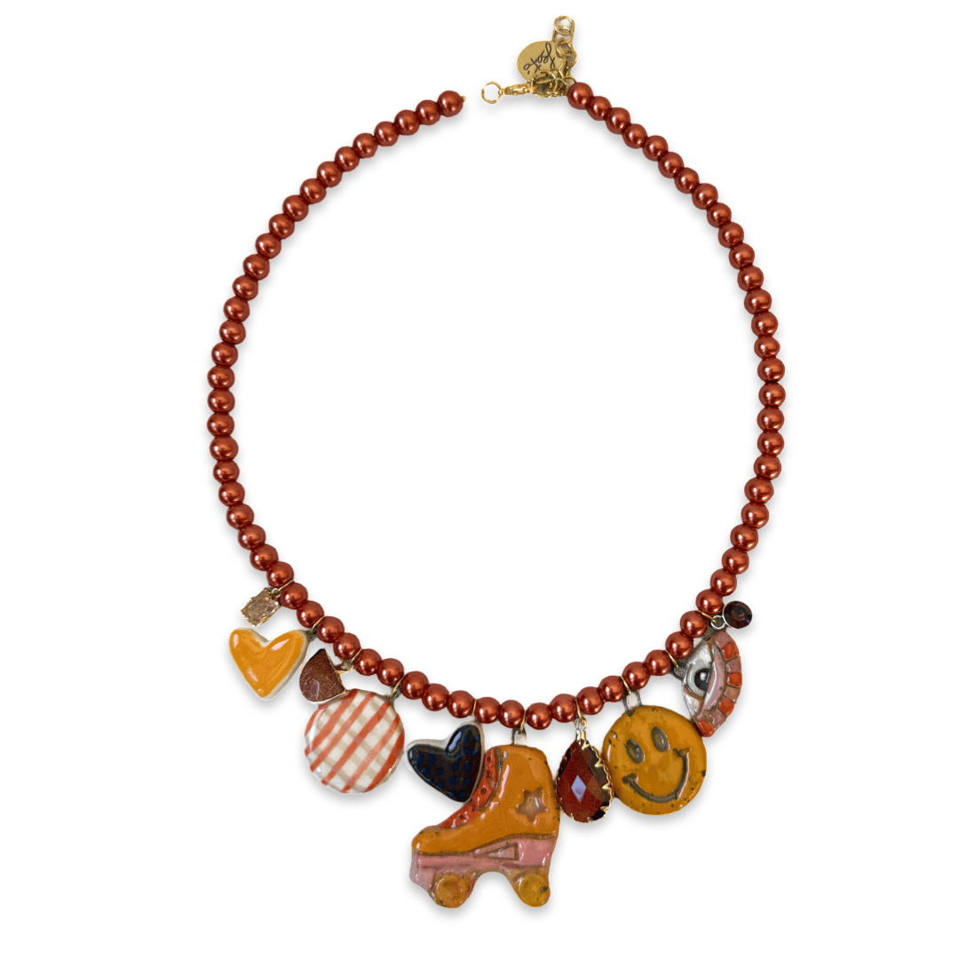 Made with glass beads , handmade/hand-painted ceramic pendants + mix of 24K gold plated metal modern charms and gold plated stainless steel clasp.