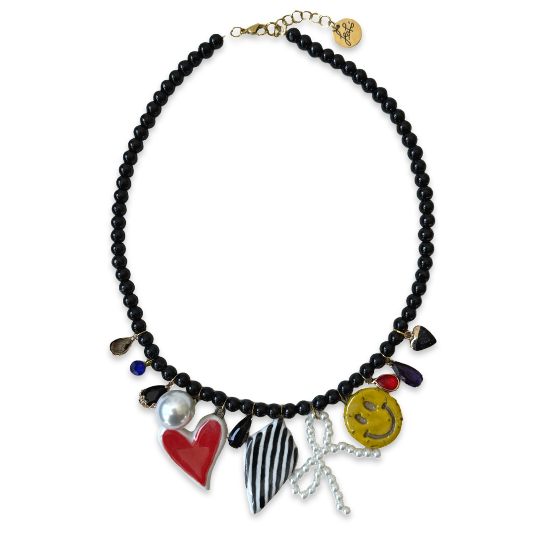 Made with glass beads , handmade/hand-painted ceramic pendants + mix of 24K gold plated metal modern charms and gold plated stainless steel clasp.