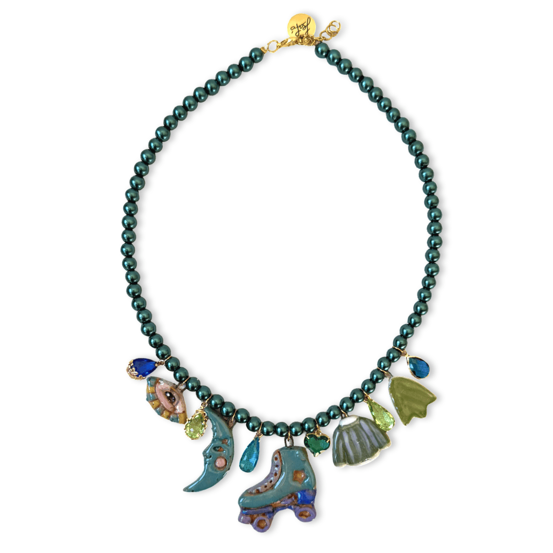 Made with glass beads , handmade/hand-painted ceramic pendants + mix of 24K gold plated metal modern charms and gold plated stainless steel clasp.