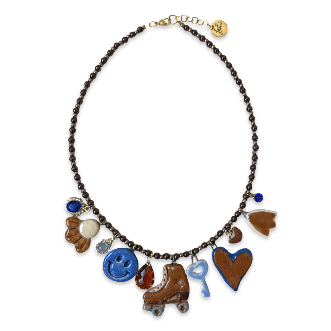 Made with glass beads , handmade/hand-painted ceramic pendants + mix of 24K gold plated metal modern charms and gold plated stainless steel clasp.