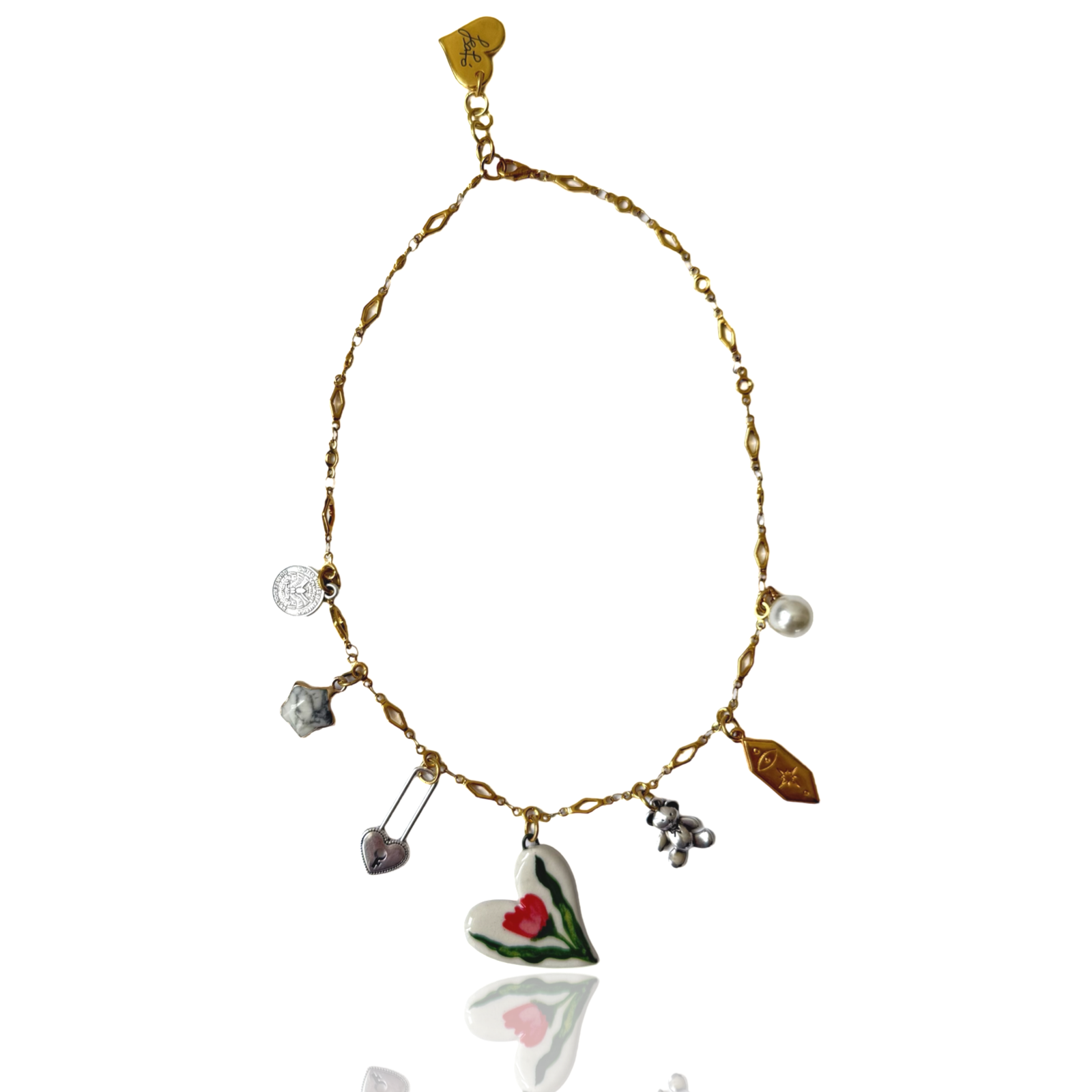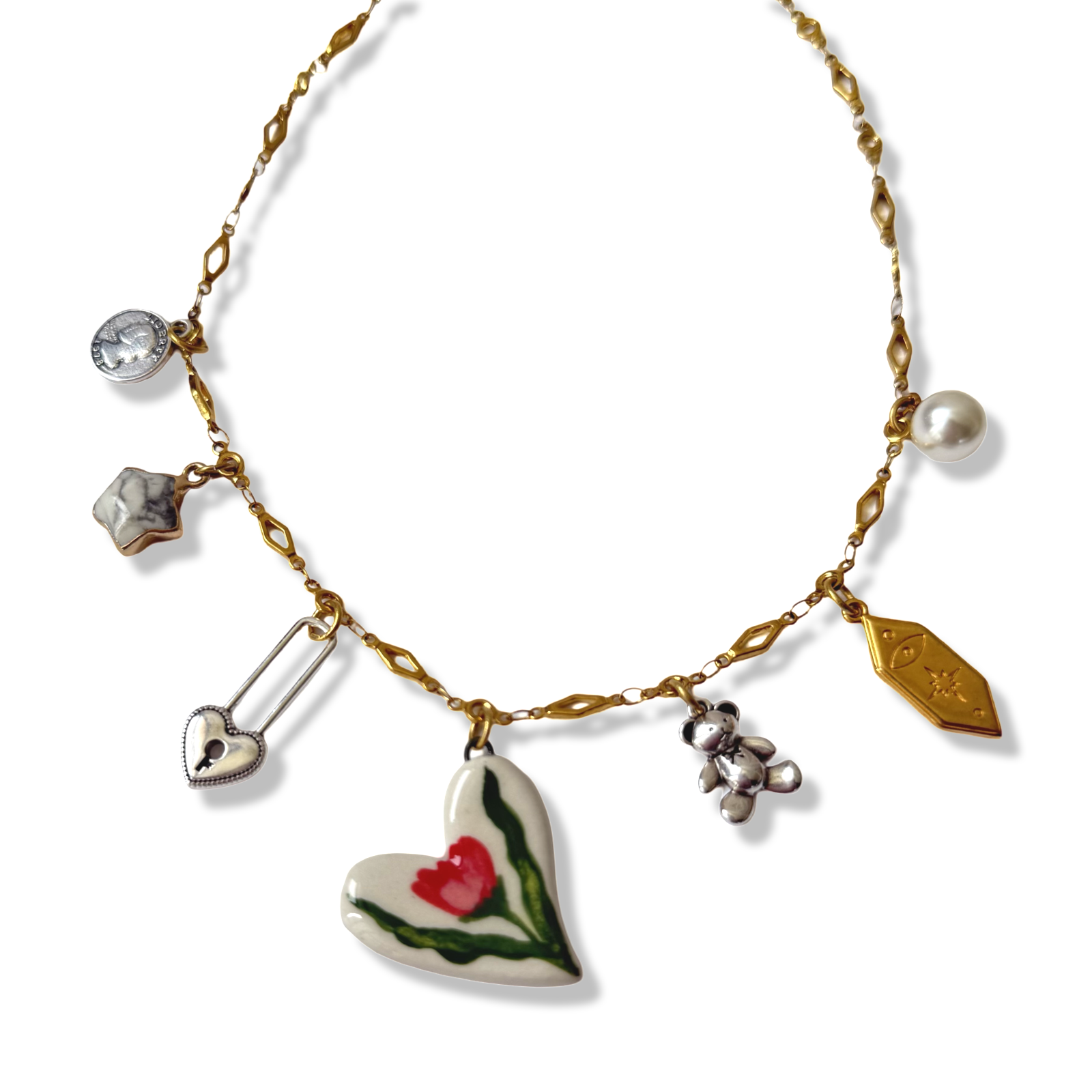 Made with stainless steel chain, silver clasp, handmade handpainted ceramic pendants, mix of silver plated metal modern charms and semi precious stone.