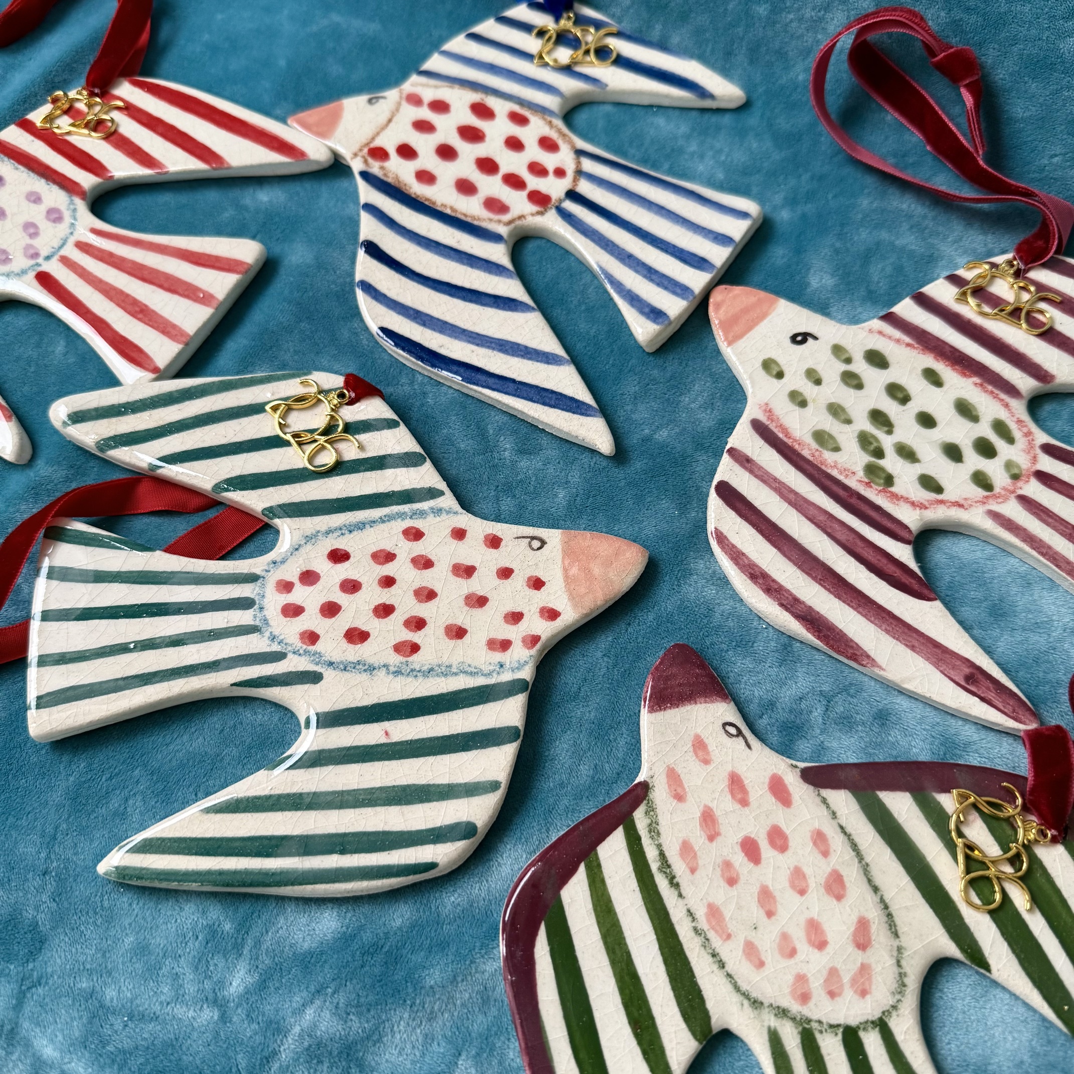 Handmade ceramic bird charm with velvet ribbon and metal 2026.